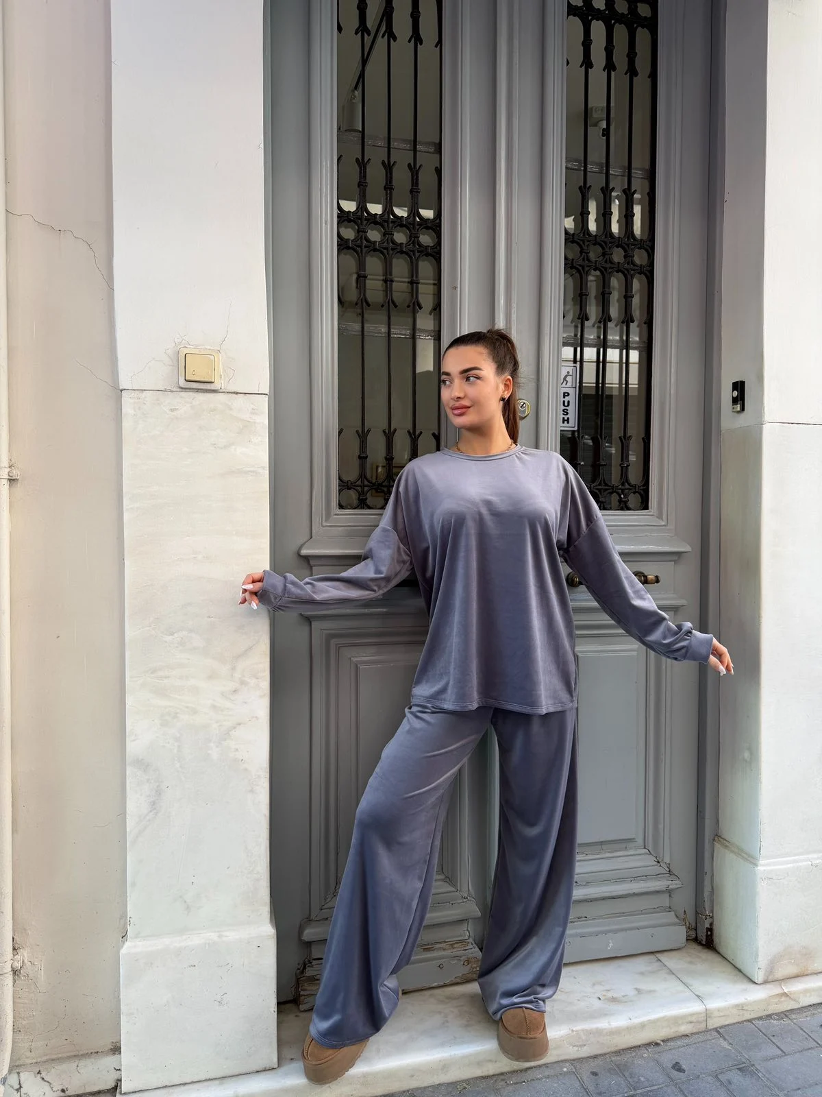 Minimal γκρι σετ με απαλή βελούδινη υφή και άνετη εφαρμογή. Ιδανική επιλογή για χαλαρές αλλά στιλάτες εμφανίσεις.