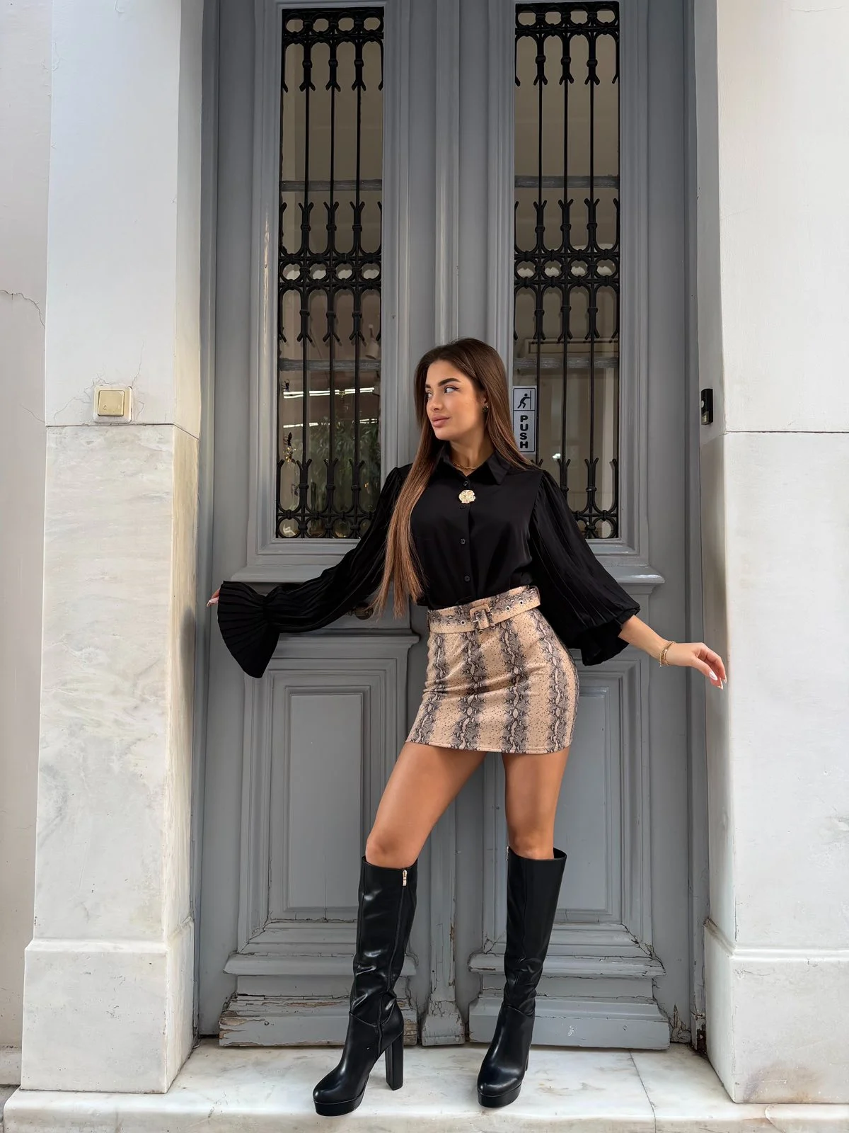 Mini φούστα με snakeskin σχέδιο που αγκαλιάζει το σώμα και αναδεικνύει τη σιλουέτα. Εφαρμοστή γραμμή με ελαστικό ύφασμα για άνεση και σταθερή εφαρμογή. Συνδυάζεται ιδανικά με πουκάμισα, tops ή knit μπλούζες για day αλλά και night εμφανίσεις.