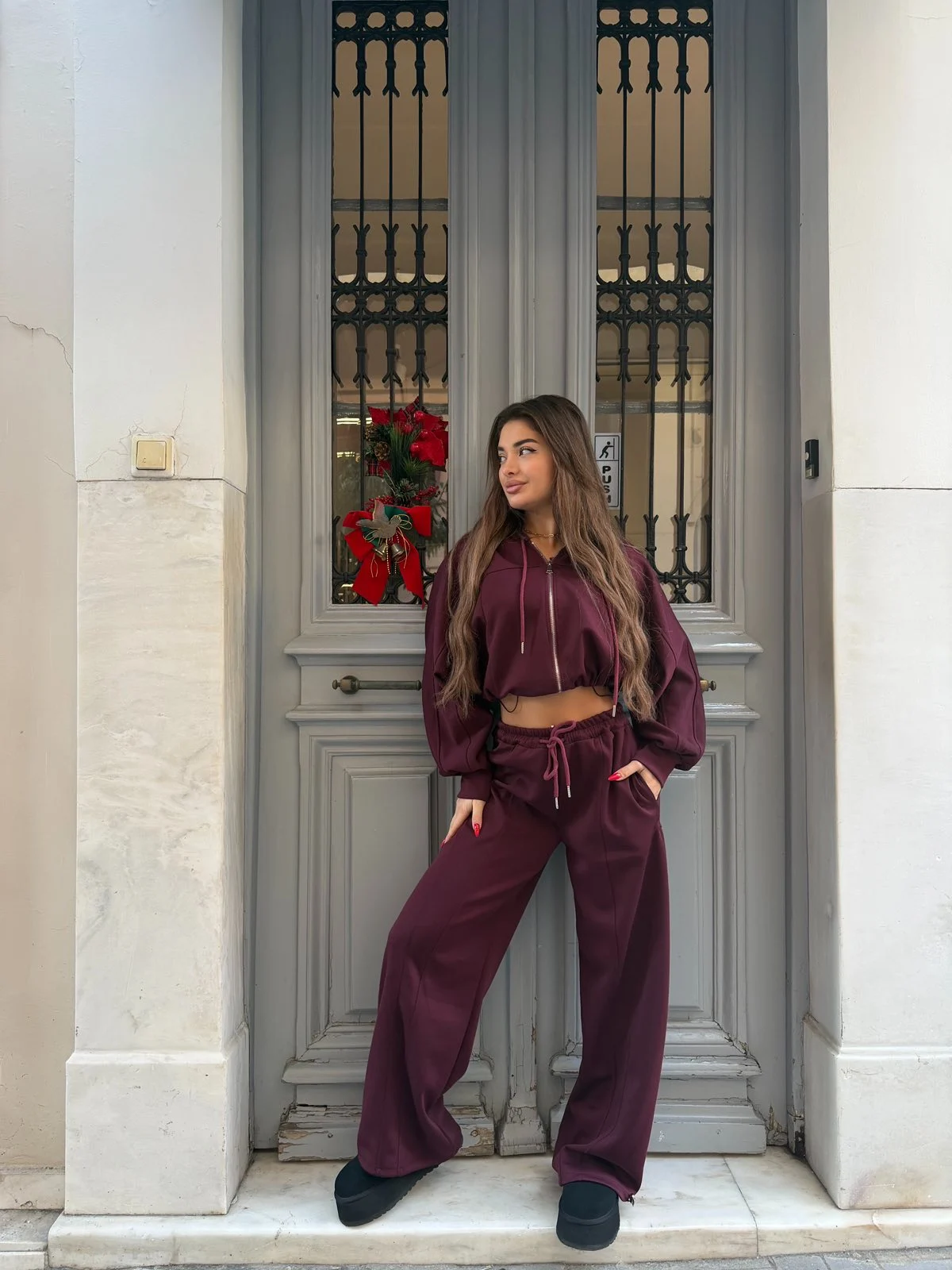 Στυλάτο καθημερινό σετ με cropped ζακέτα και άνετο παντελόνι σε elegant μπορντό απόχρωση. Διαθέτει λάστιχο στη μέση για τέλεια εφαρμογή και χαλαρή γραμμή που κολακεύει το σώμα. Ιδανικό για cozy αλλά fashionable εμφανίσεις όλη μέρα.