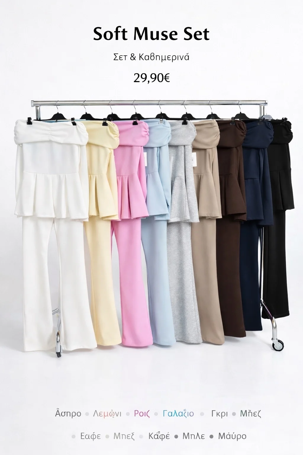 Το Soft Muse Set είναι το κομμάτι που θα φοράς από το πρωί μέχρι το βράδυ, με χαλαρή εφαρμογή που αγκαλιάζει το σώμα και προσφέρει effortless chic αποτέλεσμα.