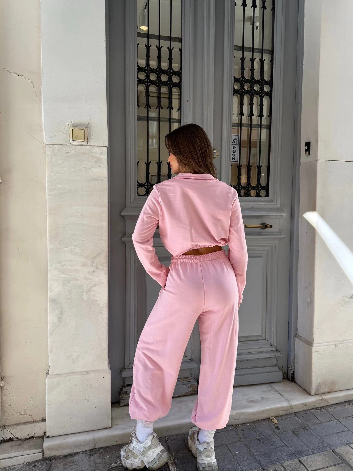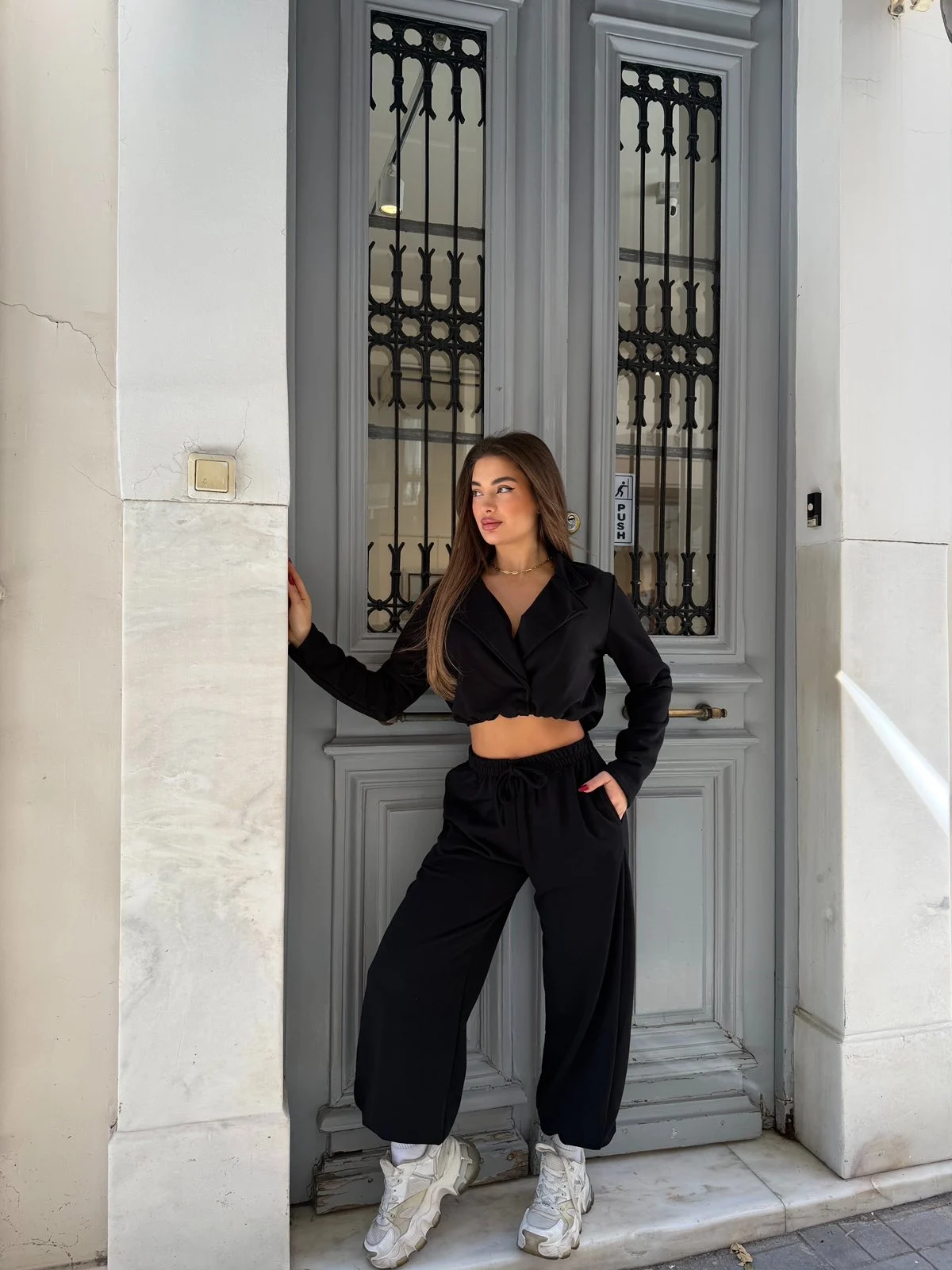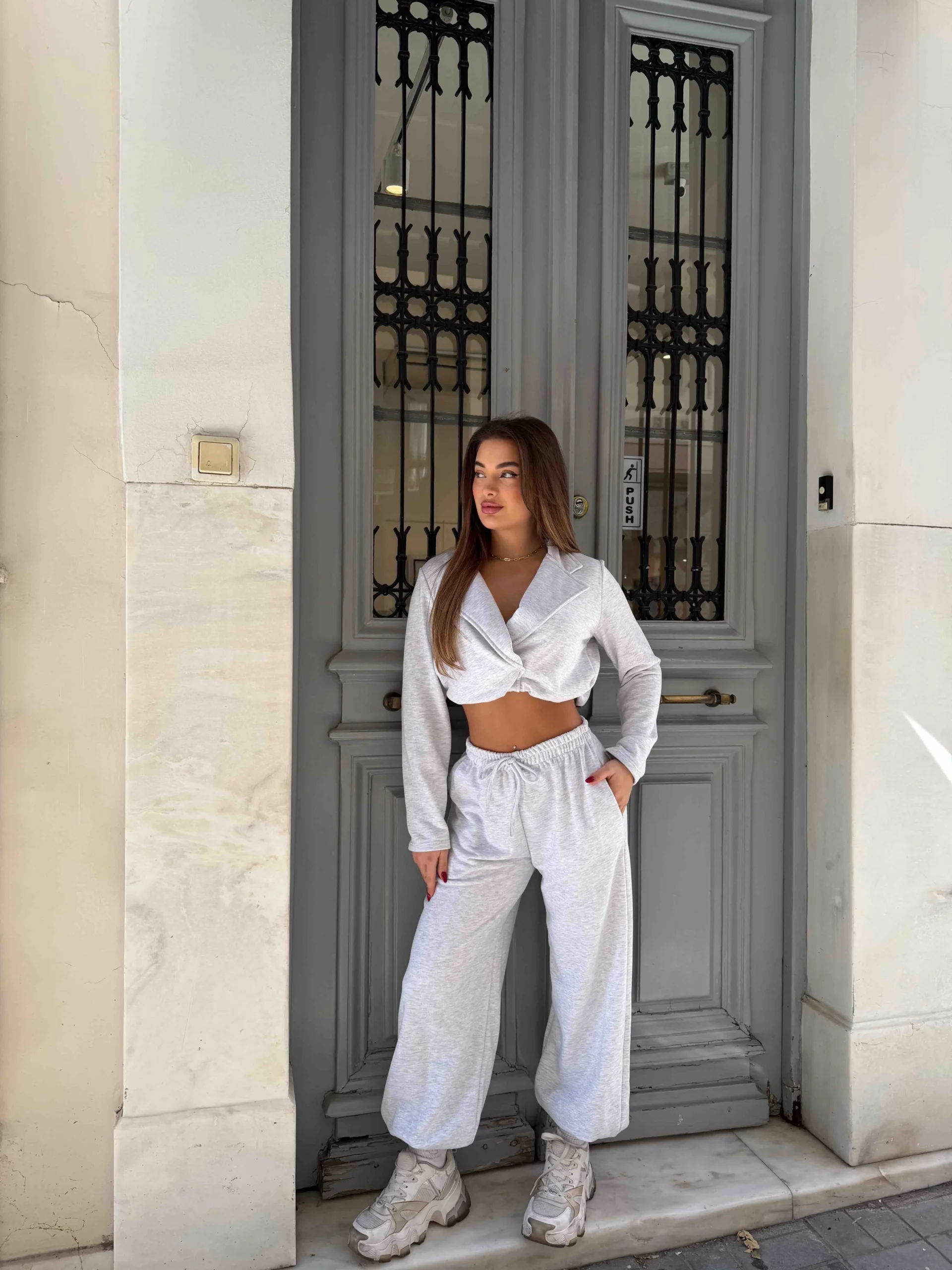 Σετ με cropped σακάκι-style μπλούζα και loose παντελόνι για effortless chic εμφανίσεις.
