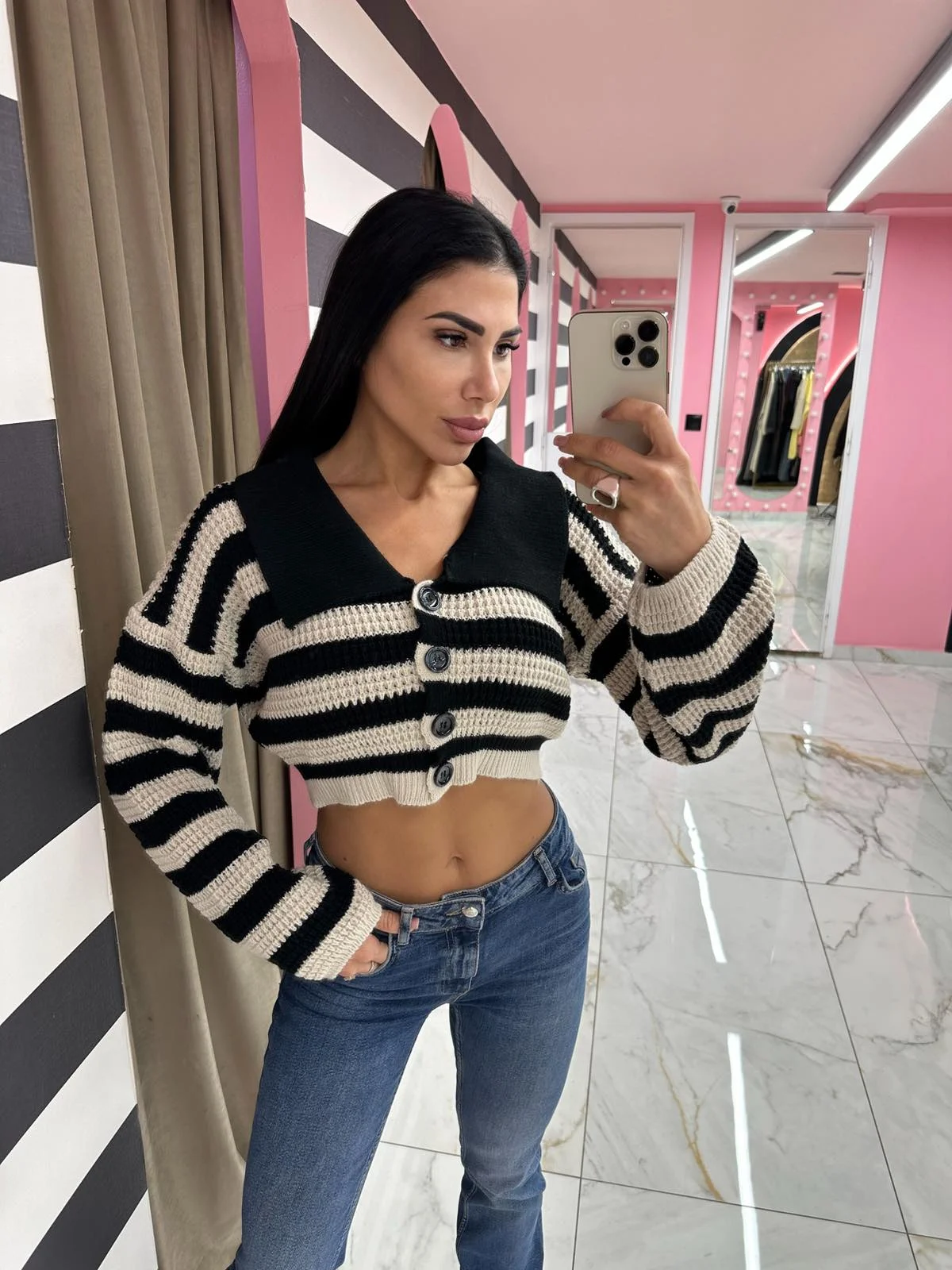 Πλεκτή cropped ζακέτα με ρίγες σε μαύρο και εκρού και φαρδύ γιακά. Διαθέτει μεγάλα κουμπιά και girly, ρετρό διάθεση — ιδανική για stylish casual εμφανίσεις.