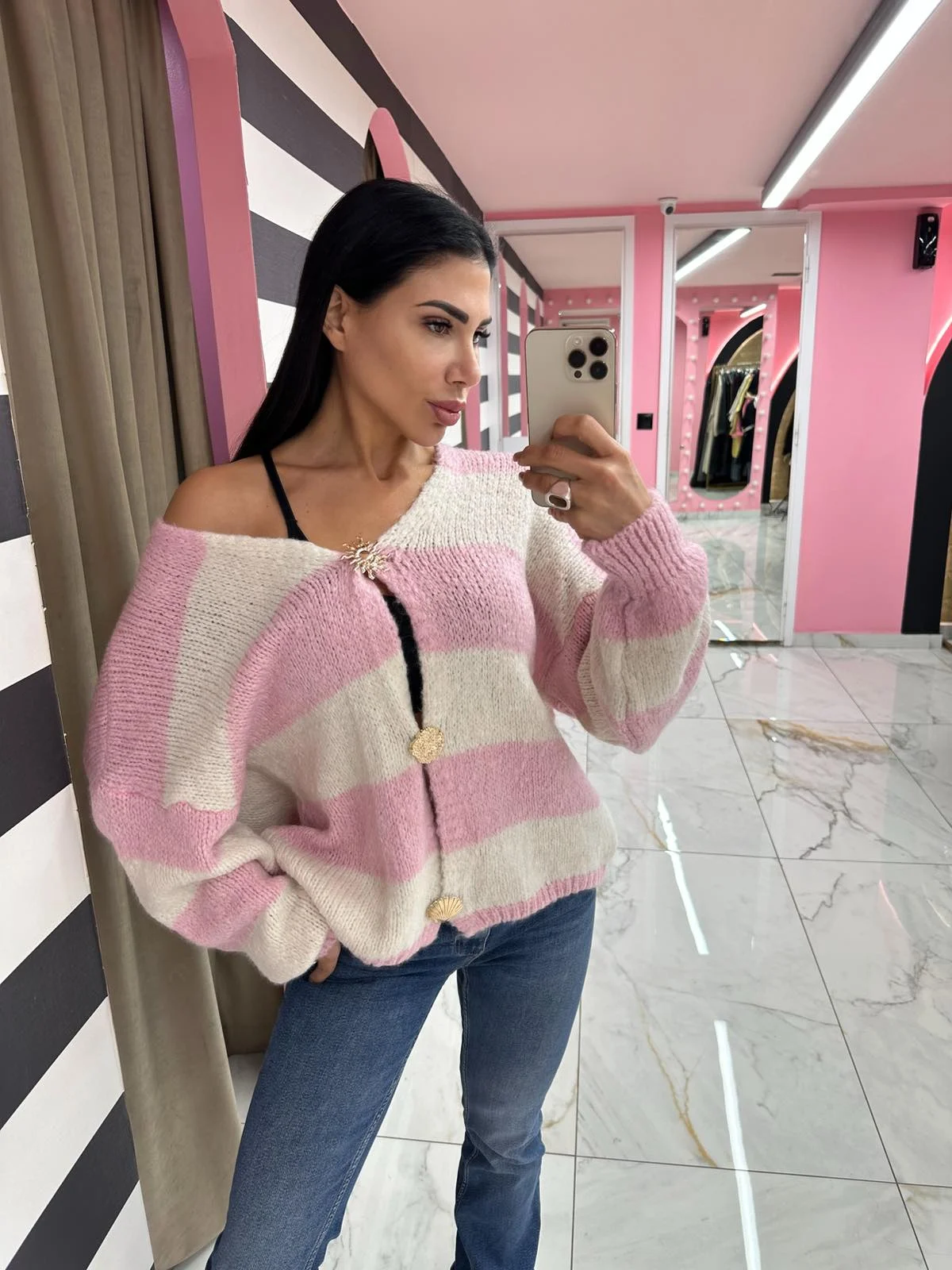 Απαλή πλεκτή ζακέτα με φαρδιές ρίγες σε ροζ και εκρού αποχρώσεις. Διαθέτει χρυσά κουμπιά και girly αισθητική που χαρίζει φωτεινότητα και ρομαντισμό σε κάθε σύνολο.