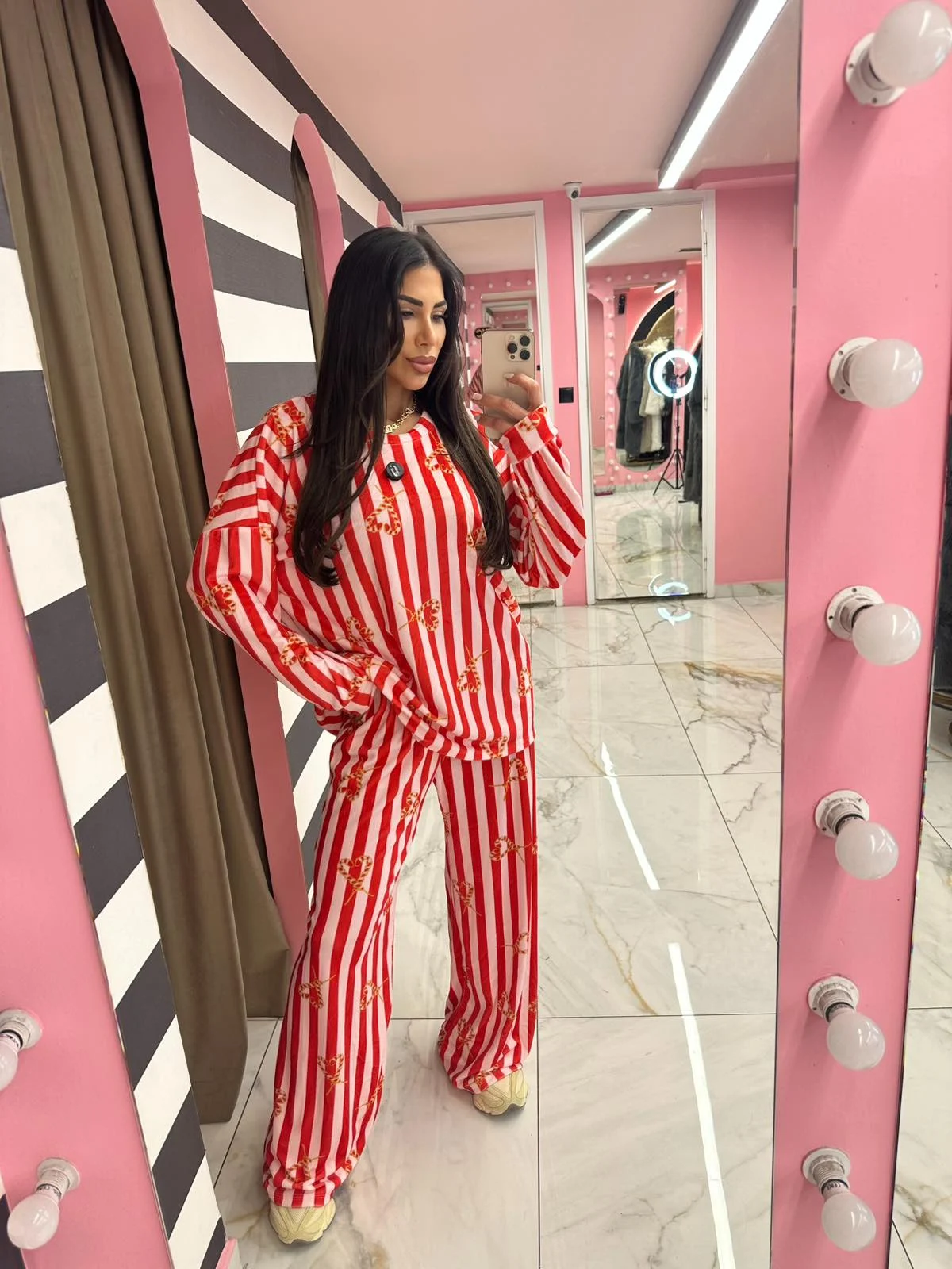 Ρομαντική πιτζάμα σε ροζ βάση με κάθετες ρίγες, καρδιές και φιόγκους. Άνετη γραμμή και μαλακό ύφασμα που προσφέρει απόλυτη άνεση για ύπνο αλλά και χαλαρές στιγμές στο σπίτι.