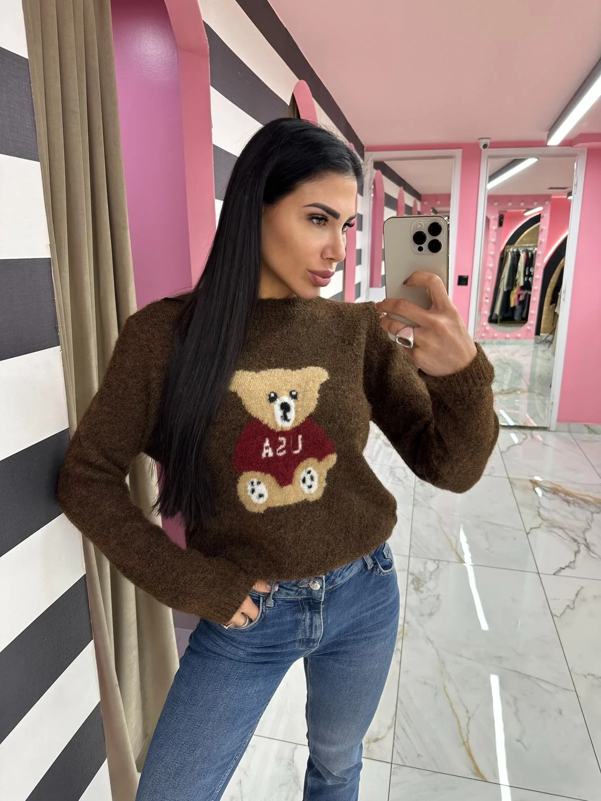 Ζεστή καφέ πλεκτή μπλούζα με teddy bear σχέδιο “USA”. Μαλακή υφή και άνετη εφαρμογή για καθημερινές cozy εμφανίσεις που ξεχωρίζουν.