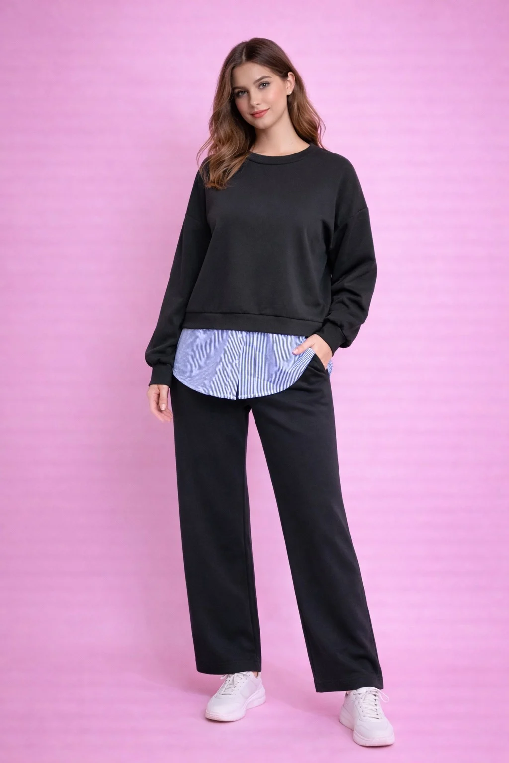 Το φούτερ έχει χαλαρή γραμμή και στο τελείωμα διαθέτει ενσωματωμένο πουκαμισάκι σε ριγέ ύφασμα που δημιουργεί stylish layered effect χωρίς να προσθέτει όγκο. Το παντελόνι είναι ίσιο, με ελαστική μέση και άνετη εφαρμογή, ιδανικό για όλη μέρα.