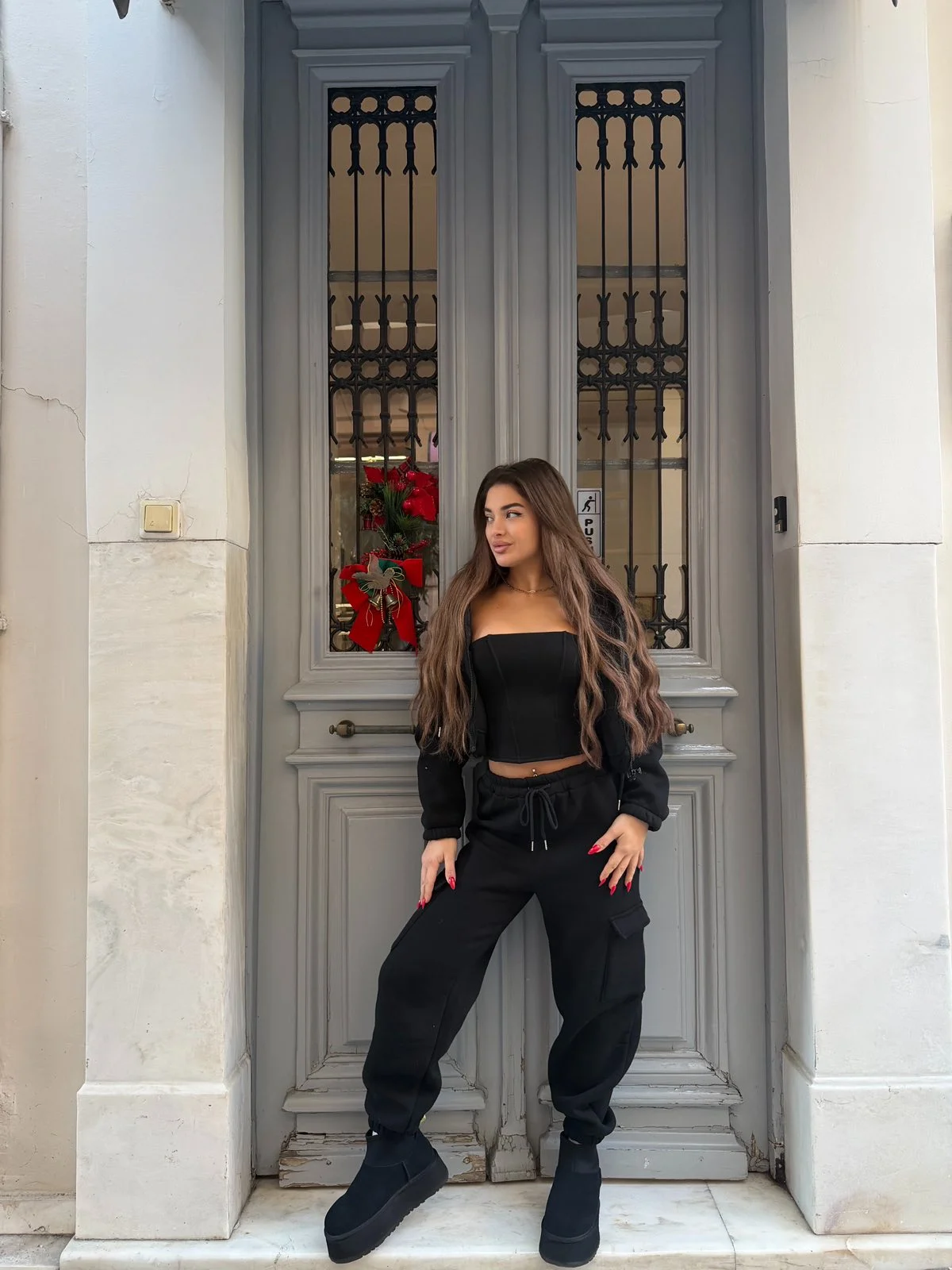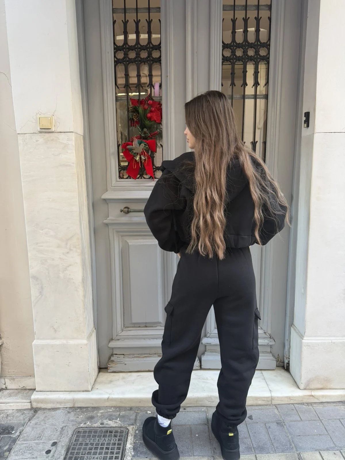Διαχρονικό μαύρο σετ 3 τεμαχίων για κάθε στιγμή. Cropped top, ζακέτα και παντελόνι σε χαλαρή γραμμή με λάστιχο στη μέση. Φοριέται εύκολα μαζί ή ξεχωριστά για endless καθημερινά outfits.