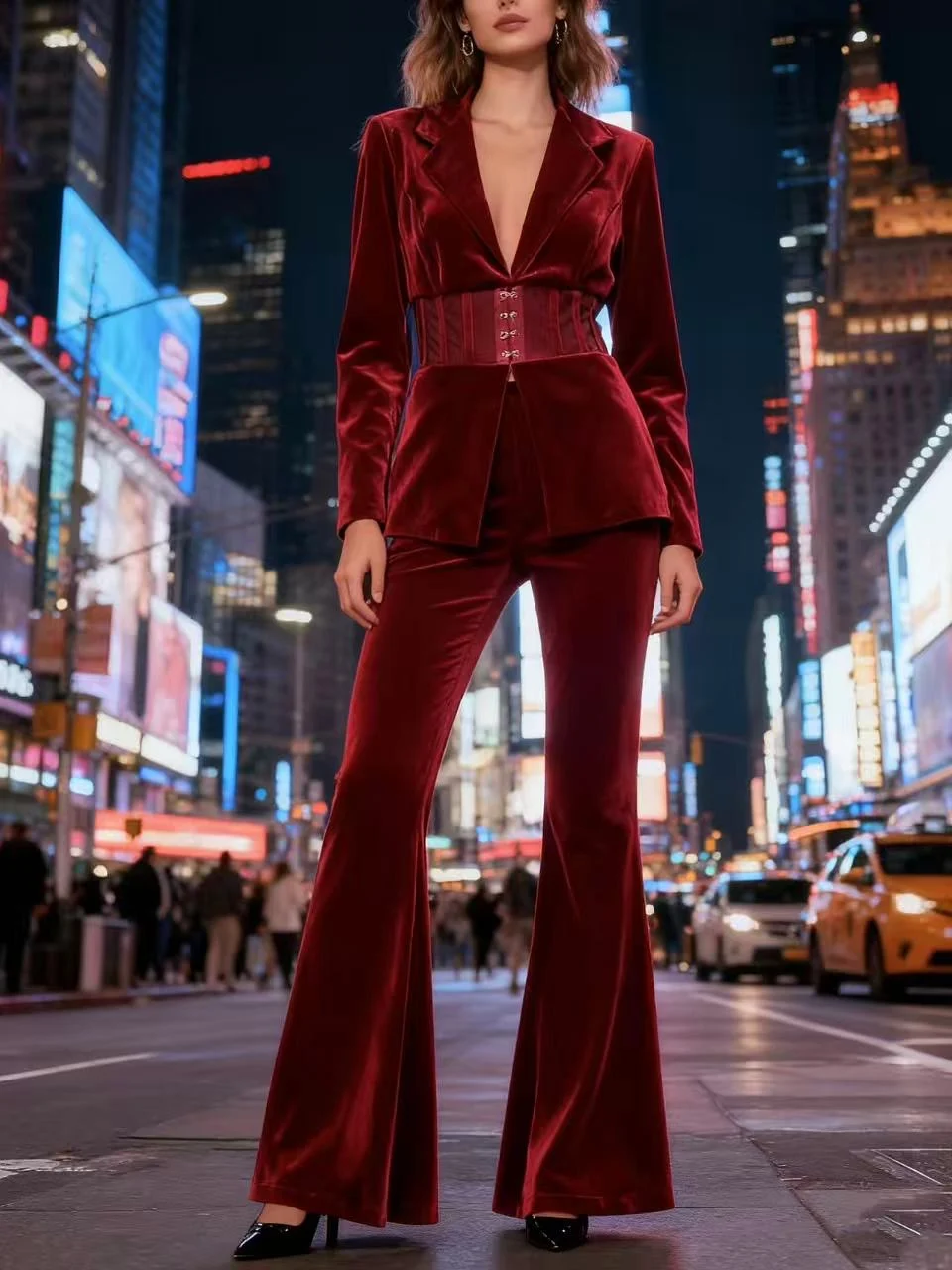Βελούδινο κοστούμι σε βαθύ κόκκινο, με signature corset-belt στο σακάκι για τέλειο shape. Λείο, λαμπερό βελούδο που αναδεικνύει τη σιλουέτα και παντελόνι καμπάνα για super elongating effect. Must-have επιλογή για βραδινές εξόδους & events.