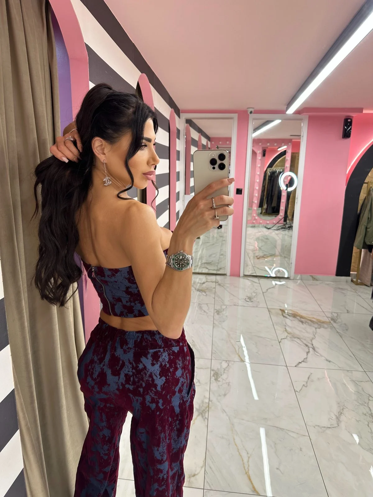 Κορσέ-τοπ σε μπορντό–μπλε αποχρώσεις με εντυπωσιακή βελούδινη υφή. Τονίζει υπέροχα τη μέση, στηρίζει το μπούστο και δίνει άκρως glam εμφάνιση. Ιδανικό για total looks με το ίδιο παντελόνι ή για minimal chic outfit συνδυασμούς.