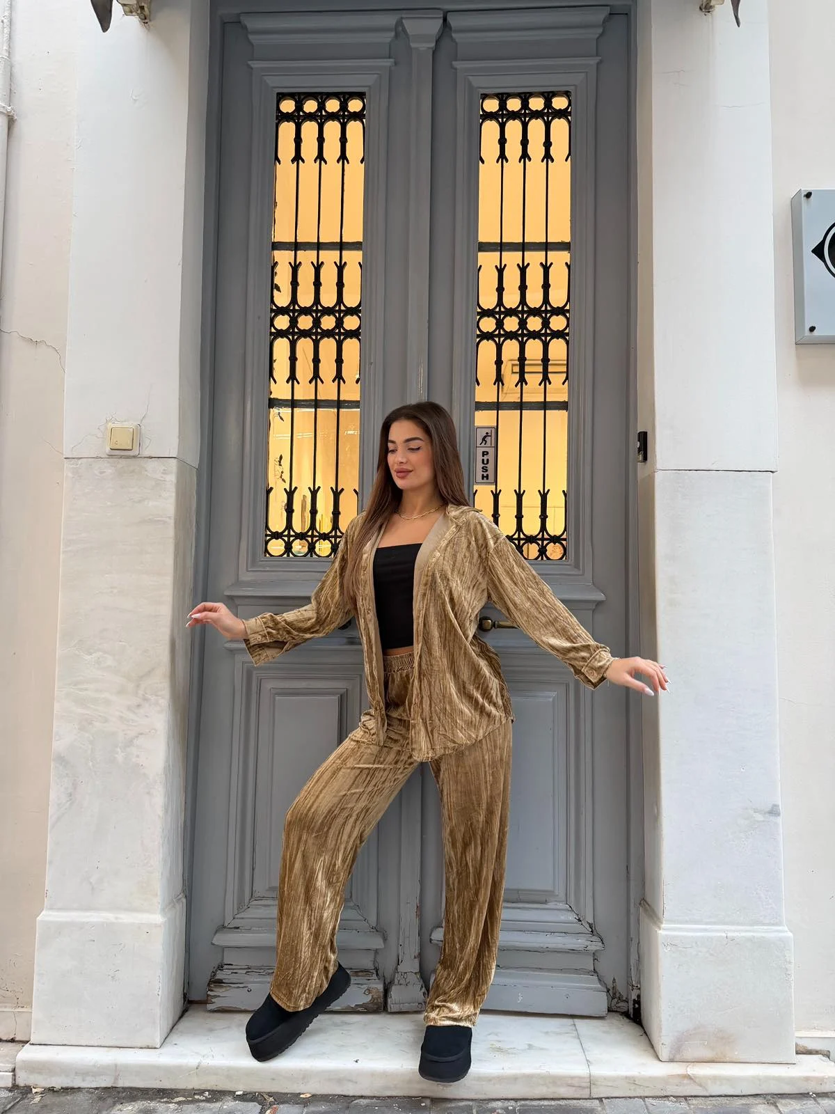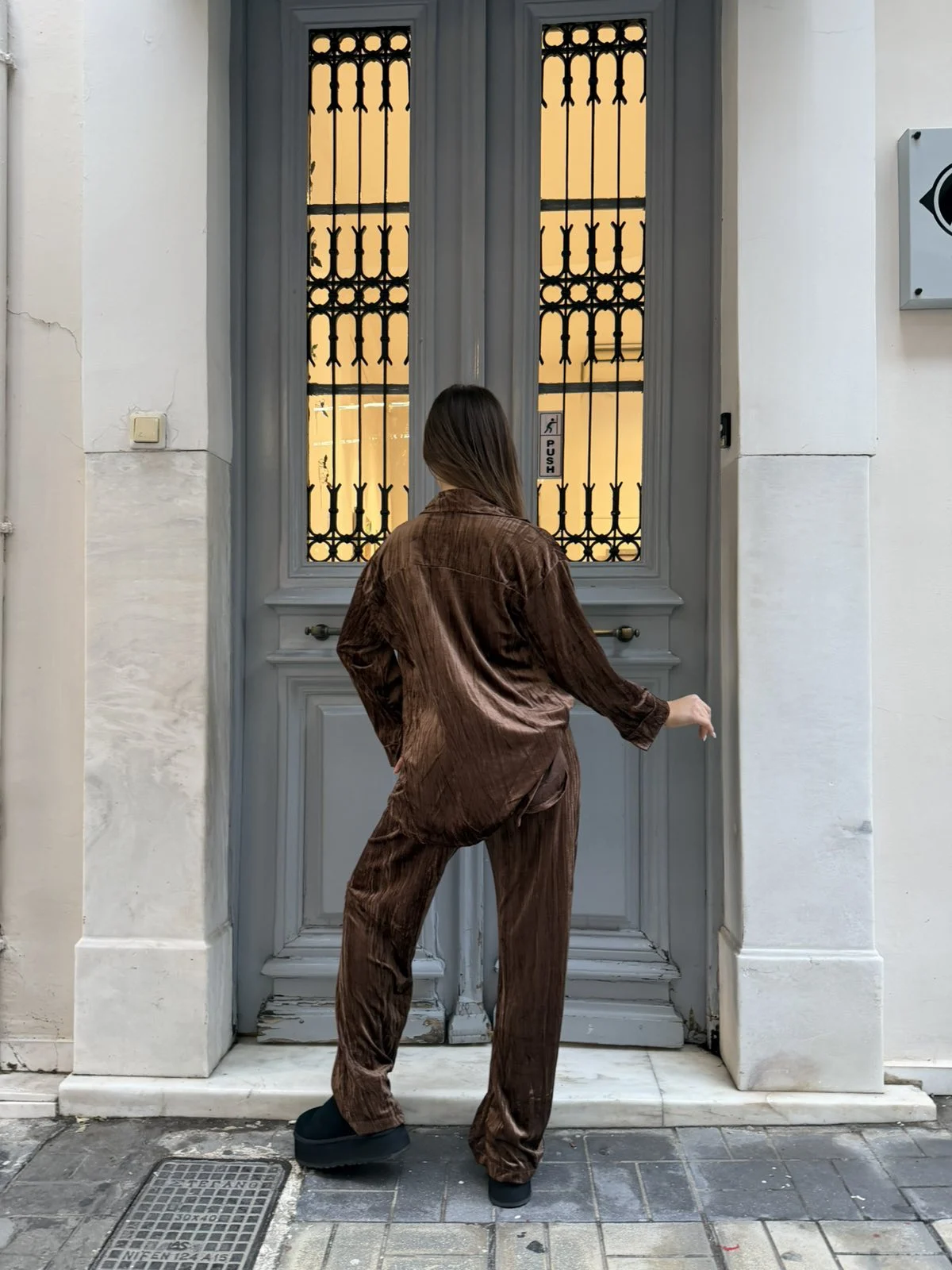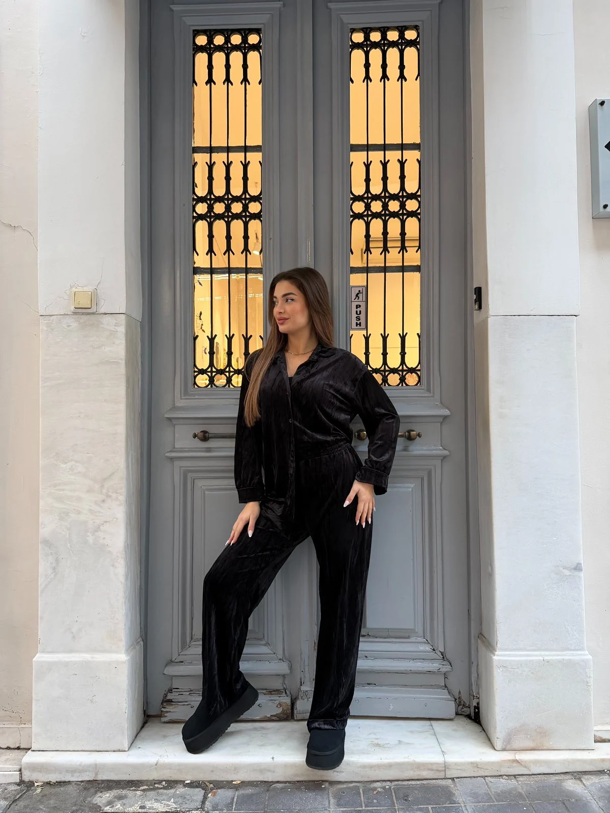 Κομψό σετ από απαλό velvet ύφασμα που χαρίζει πολυτελή αίσθηση και άνετη εφαρμογή. Αποτελείται από πουκάμισο με χαλαρή γραμμή και παντελόνι με άνετη εφαρμογή, ιδανικό για καθημερινές αλλά και πιο ιδιαίτερες εμφανίσεις. Φοριέται μαζί ως σετ ή ξεχωριστά, προσφέροντας πολλές επιλογές styling.