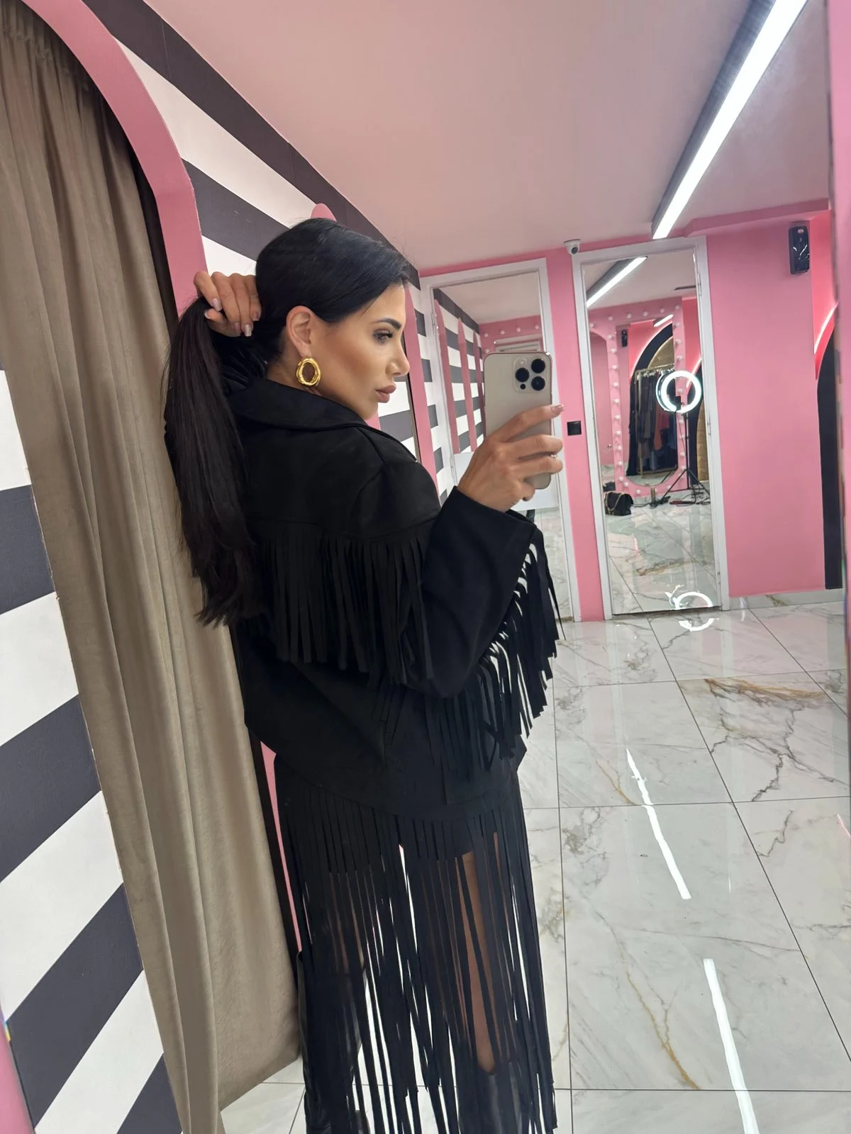 Το Western Spirit Jacket Black είναι η πιο edgy εκδοχή του western στυλ. Oversized, με μακριά κρόσσια και suede υφή, δίνει έντονη παρουσία σε κάθε εμφάνιση. Συνδύασέ το με μπότες και δερμάτινη φούστα για εντυπωσιακό all-black outfit.