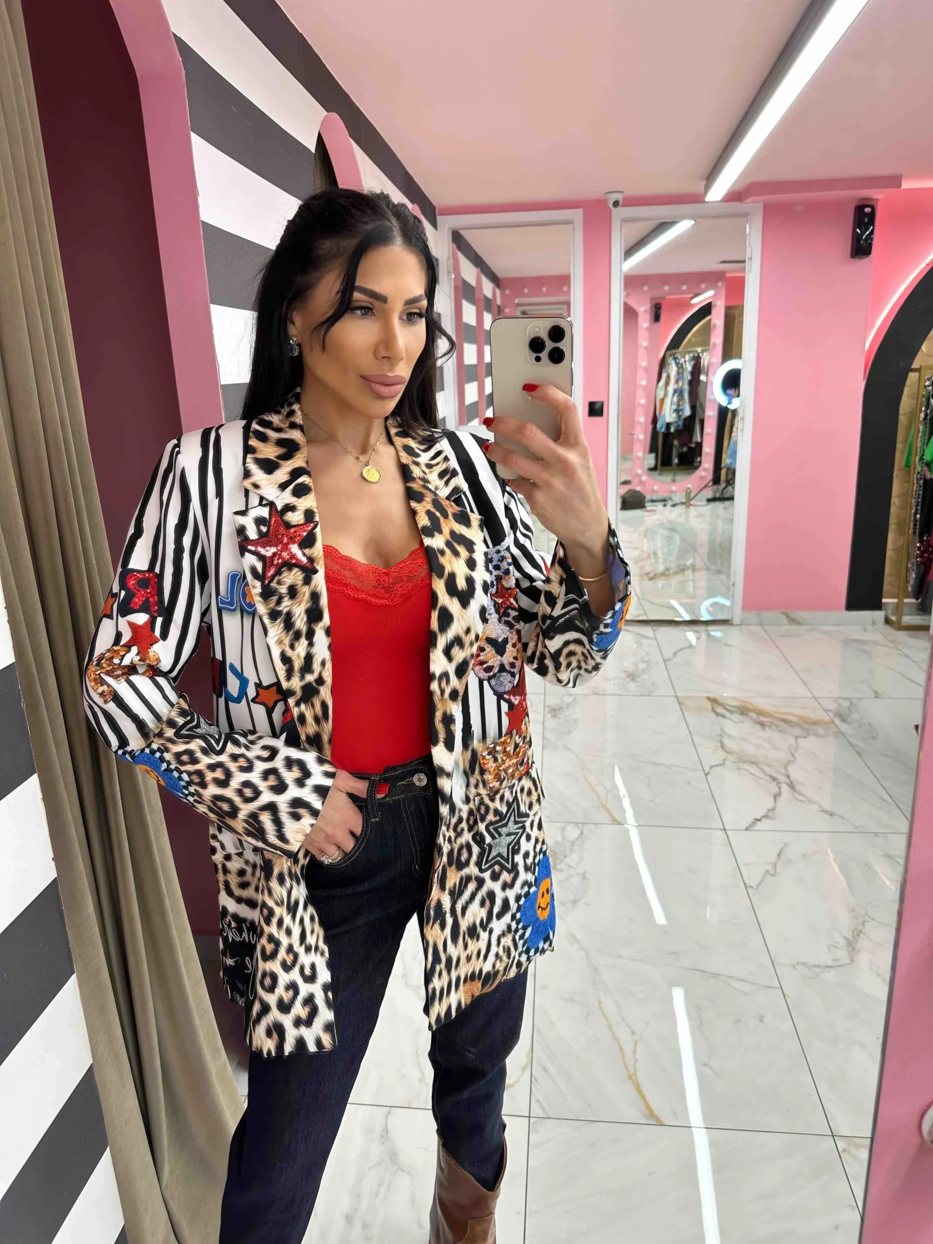 Εντυπωσιακό σακάκι με μοναδικό mix από leopard prints, ρίγες και πολύχρωμα διακοσμητικά στοιχεία με αστέρια και σχέδια που δημιουργούν ένα ιδιαίτερο fashion αποτέλεσμα. Statement κομμάτι που δίνει δυναμικό χαρακτήρα σε κάθε εμφάνιση και αναβαθμίζει ακόμα και το πιο απλό outfit. Ιδανικό για μοντέρνα και fashion looks από το πρωί μέχρι το βράδυ.