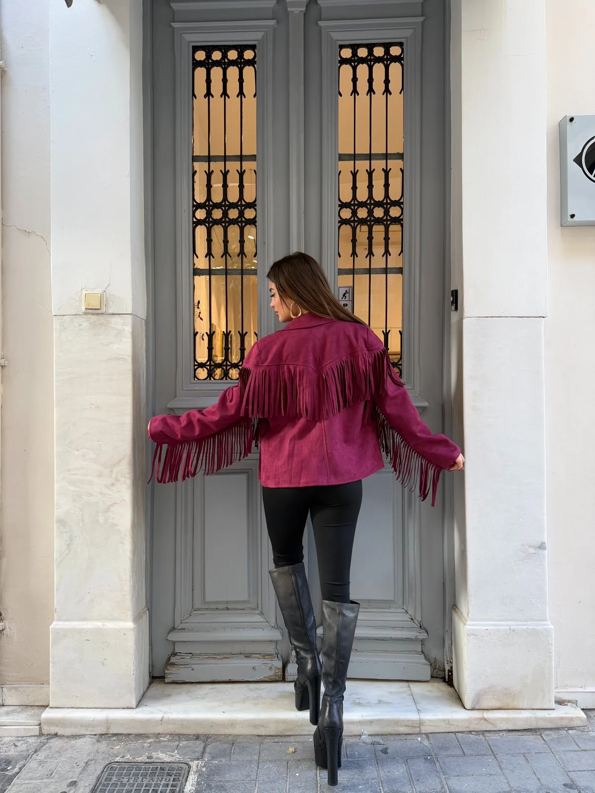 Boho glam διάθεση σε βαθύ μπορντό suede. Με statement κρόσσια και κουμπιά μπροστά, το Wine Fringe Jacket θα αναβαθμίσει το στυλ σου με μια κίνηση.