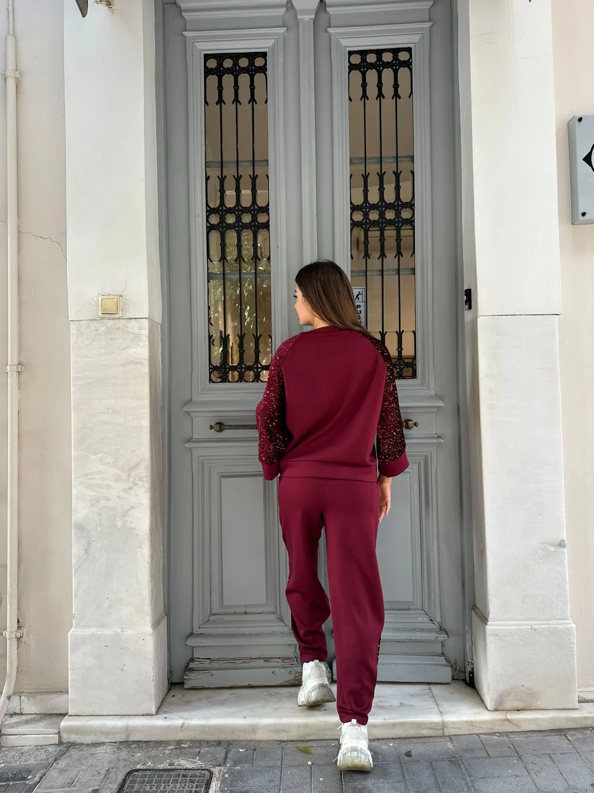 Σετ σε πλούσια μπορντό απόχρωση, με ταιριαστές παγιέτες που προσθέτουν πολυτέλεια στο look. Άνετο, ελαστικό και τέλειο για ημέρα και βραδάκι.