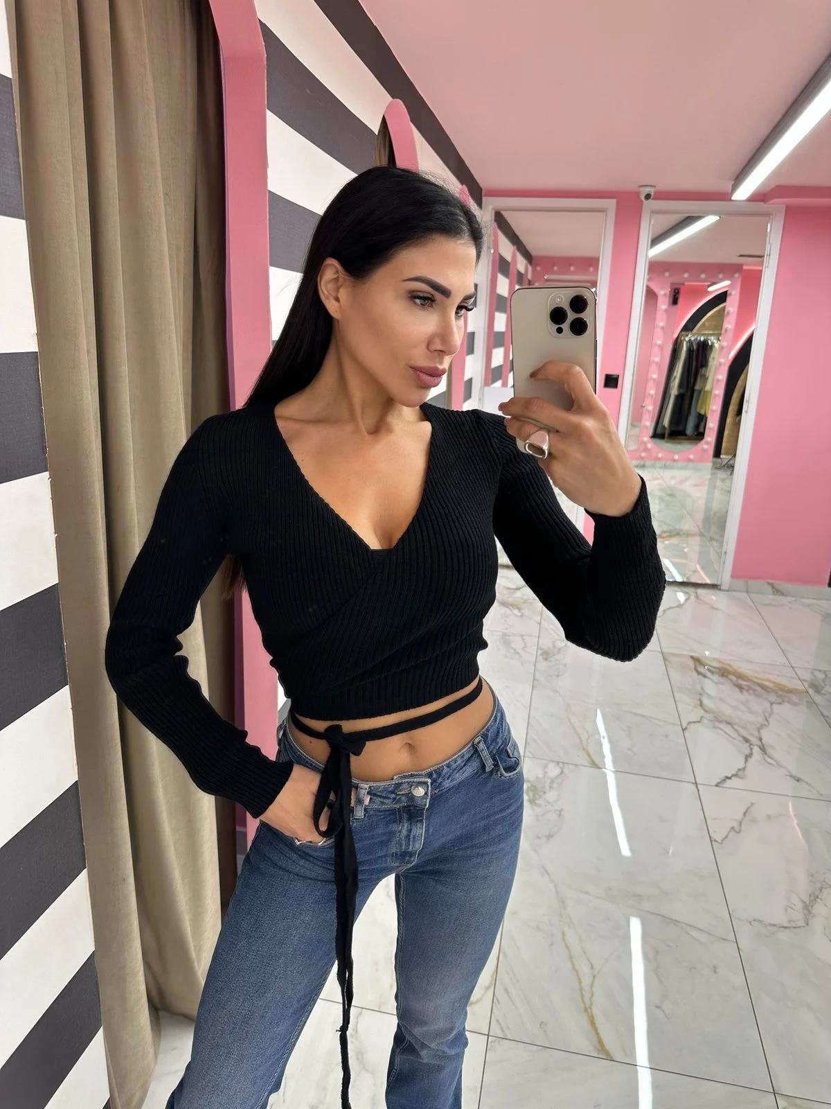 Εφαρμοστό rib τοπ με τύλιγμα στη μέση και V λαιμόκοψη. Κολακεύει τη σιλουέτα και δίνει ένα θηλυκό, minimal look που μπορεί να φορεθεί από το πρωί έως το βράδυ.