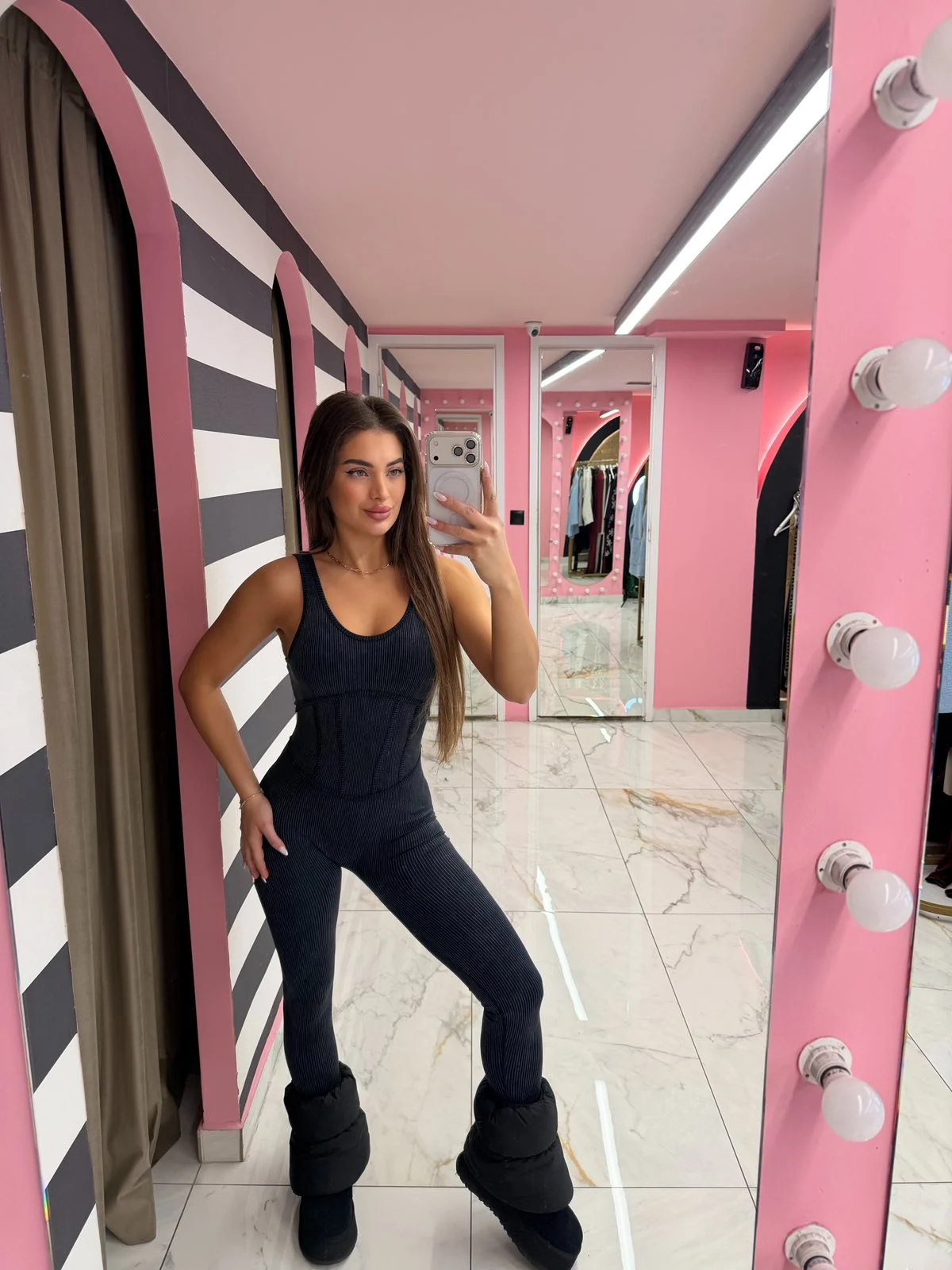 Κλασική και δυναμική ολόσωμη φόρμα σε μαύρο χρώμα που μαζεύει έντονα το σώμα και χαρίζει sleek αποτέλεσμα. Ελαστικό rib ύφασμα με τέλεια εφαρμογή, δεν διαφανίζει και προσφέρει άνεση όλη μέρα.