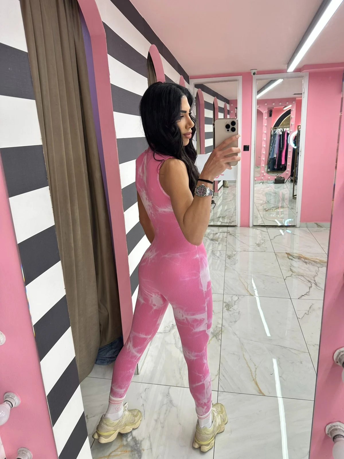 Θηλυκή και super flattering φόρμα σε ροζ αποχρώσεις που φωτίζουν το σώμα. Το ύφασμα εφαρμόζει τέλεια, κρατάει την κοιλιά και δίνει σμιλευμένο αποτέλεσμα στη μέση και τους γλουτούς. Από τις πιο εντυπωσιακές επιλογές της συλλογής.