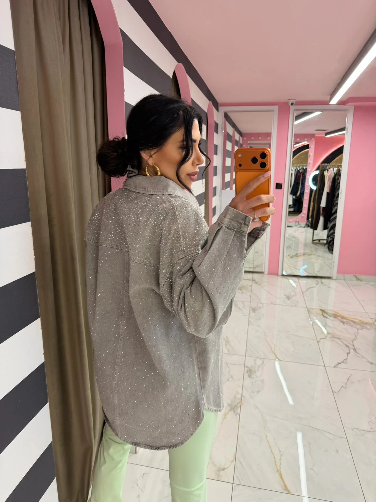 Sleek & μοντέρνο ✨ Το γκρι denim πουκάμισο με λαμπερά στρας είναι το απόλυτο neutral κομμάτι που ταιριάζει με όλα.