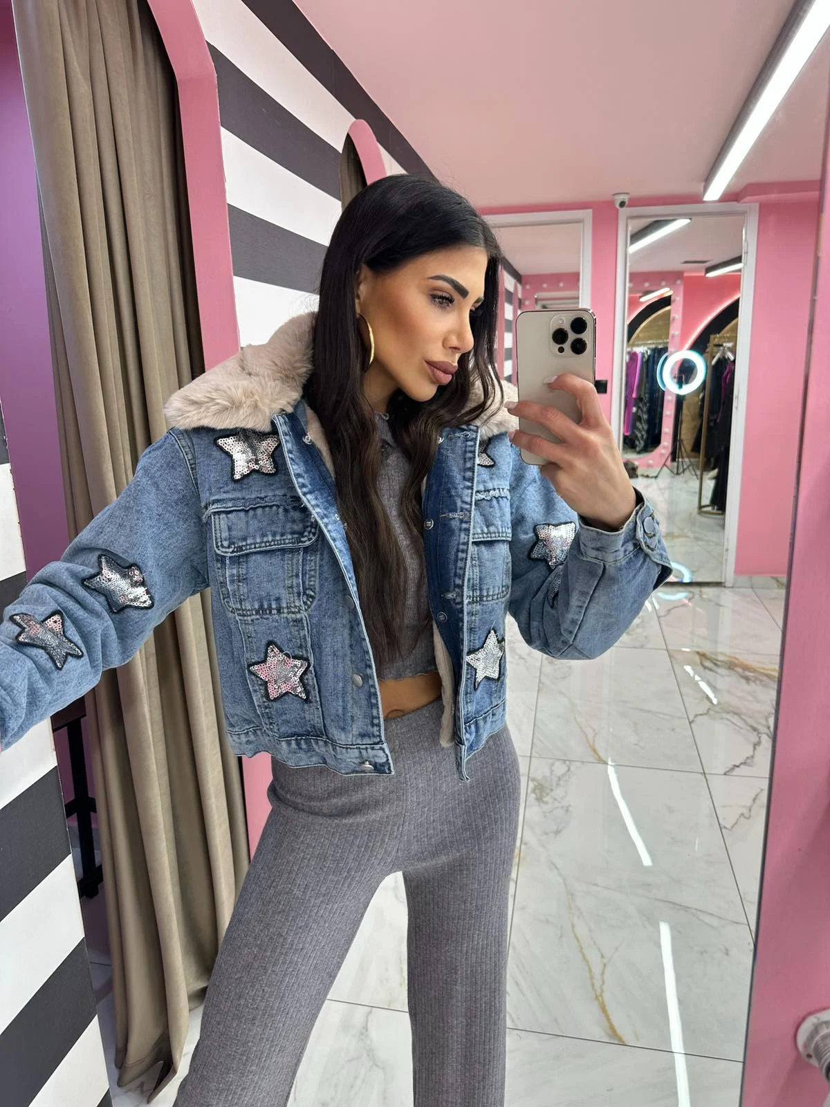 Statement τζιν jacket που απογειώνει κάθε εμφάνιση. Διαθέτει αποσπώμενη γούνα στον γιακά για να φοριέται και ως χειμερινό αλλά και ως κλασικό τζιν μπουφάν. Οι διακοσμητικές αστέρες με λεπτομέρειες προσθέτουν glam χαρακτήρα, ενώ η cropped γραμμή το κάνει ιδανικό για casual αλλά και πιο fashion looks.