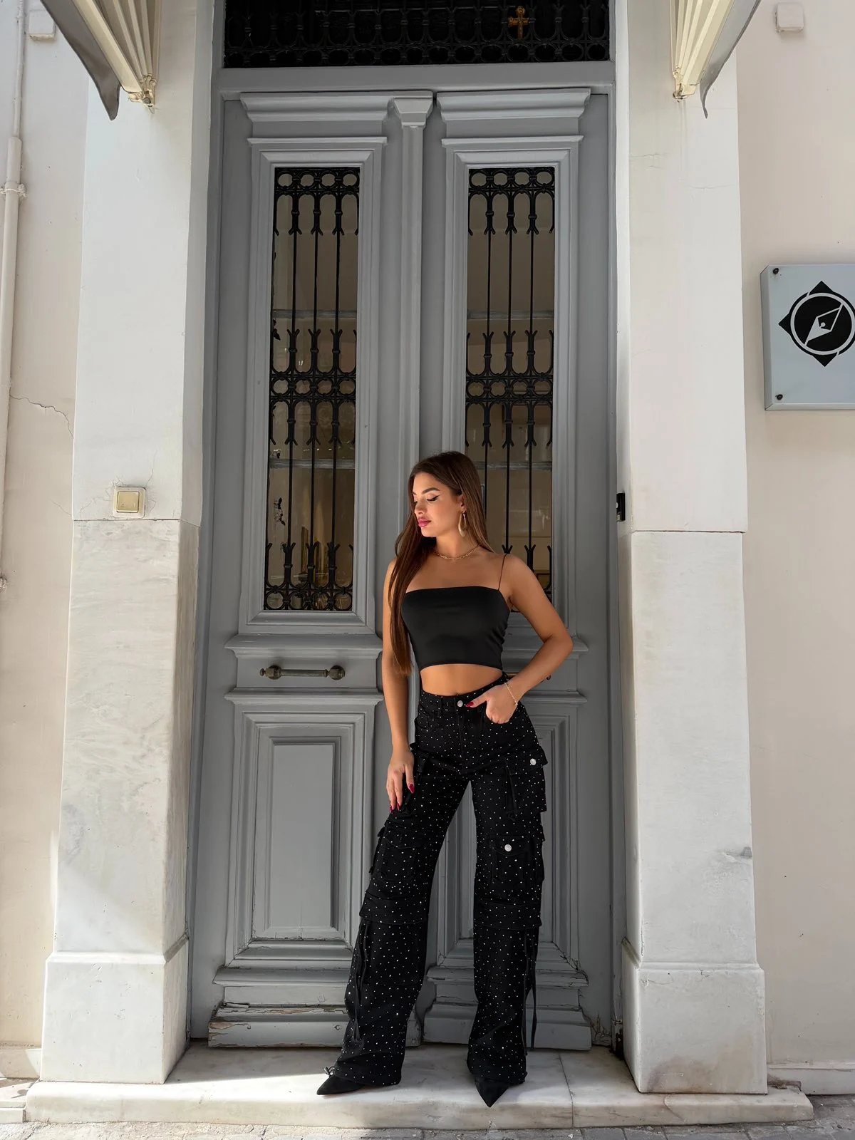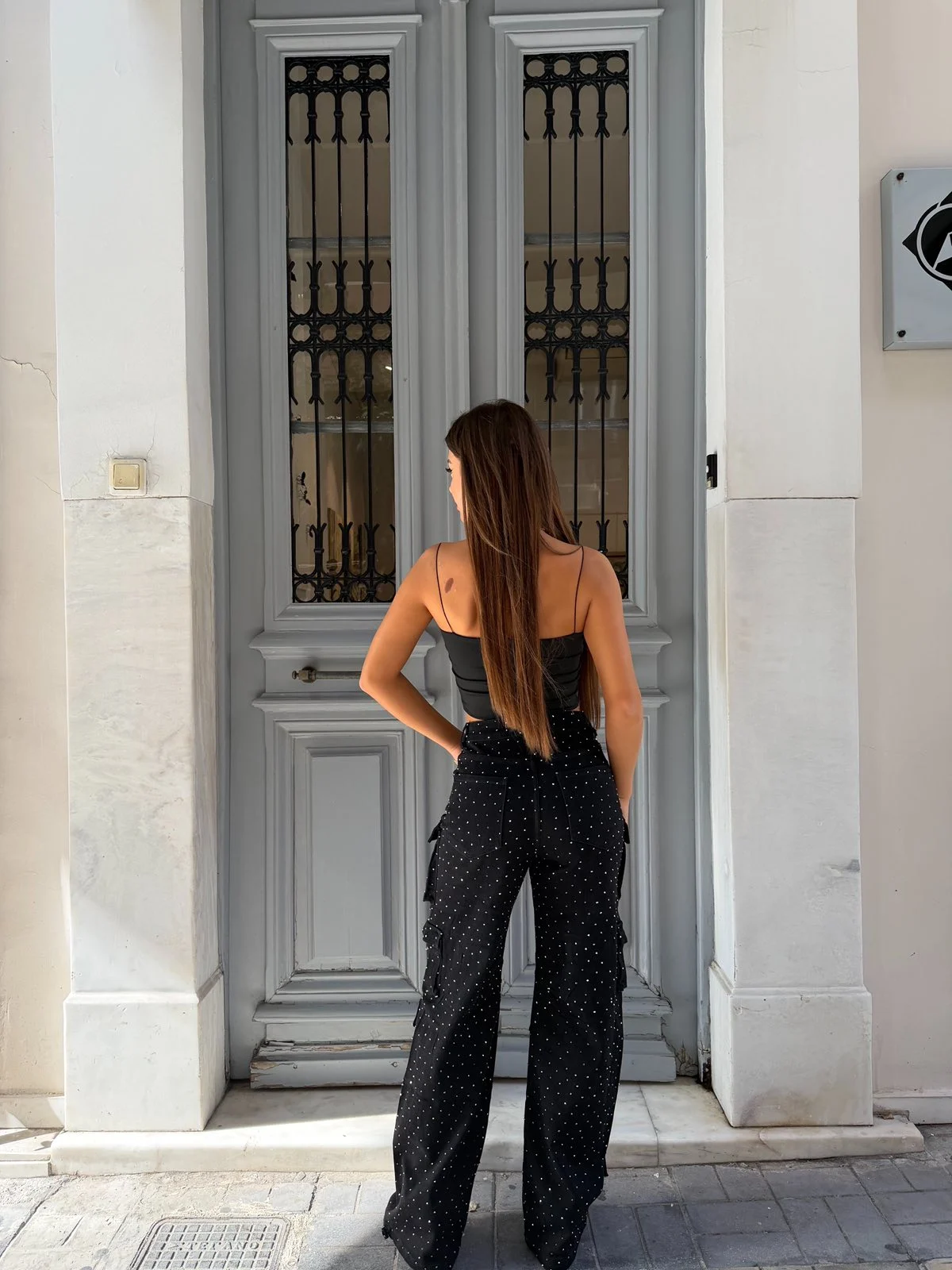 Statement cargo παντελόνι που λάμπει! Μαύρη βάση με διακριτικά στρασάκια σε όλη την επιφάνεια, φαρδιά γραμμή και πρακτικές τσέπες στα πλάγια. Το απόλυτο mix άνεσης και glam που θα αναβαθμίσει κάθε σου outfit!