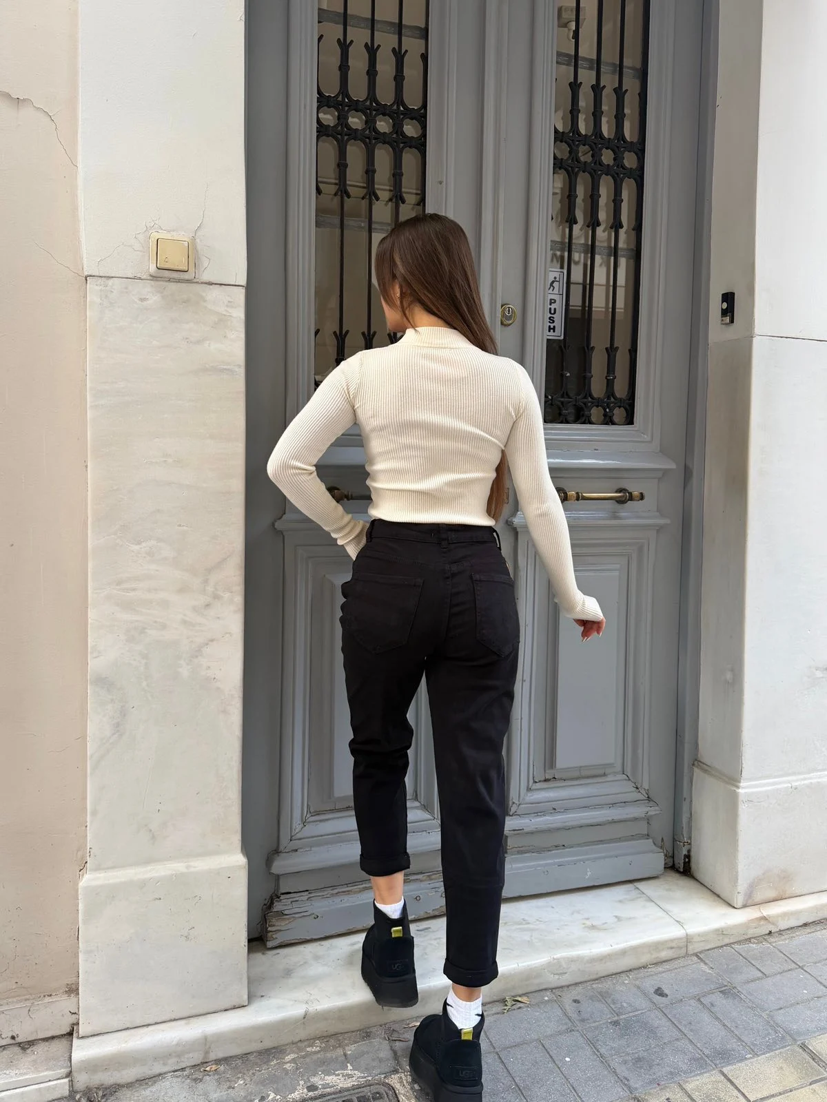 Η ψηλόμεση γραμμή του κολακεύει τη μέση, ενώ το μαύρο χρώμα το καθιστά εύκολο στους συνδυασμούς – από casual εμφανίσεις μέχρι πιο chic looks. Φόριέται άνετα όλη μέρα, χωρίς να χάνει το σχήμα του.