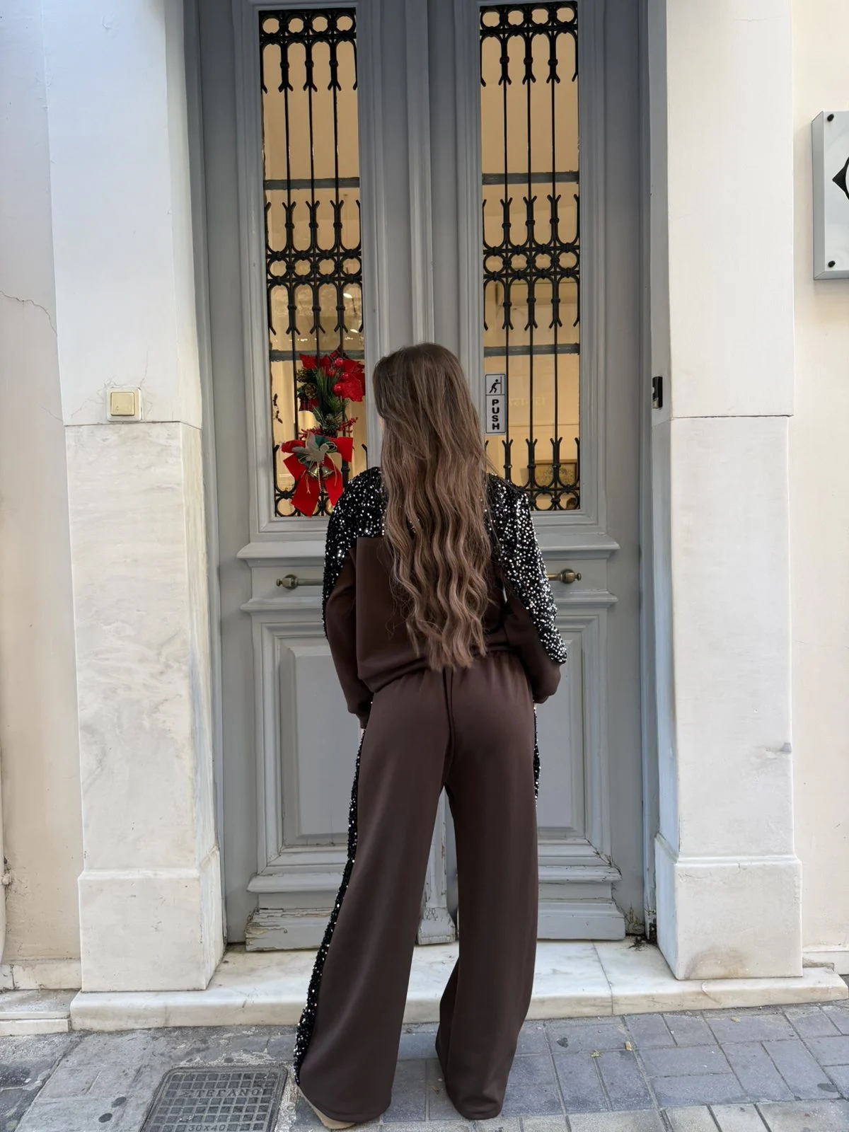 Ζεστή σοκολατί απόχρωση που φοριέται από το πρωί ως το βράδυ. Το signature σχέδιο με παγιέτες το κάνει ξεχωριστό χωρίς να χάνει την άνεσή του. One size, ελαστικό, άνεση και στιλ μαζί.
