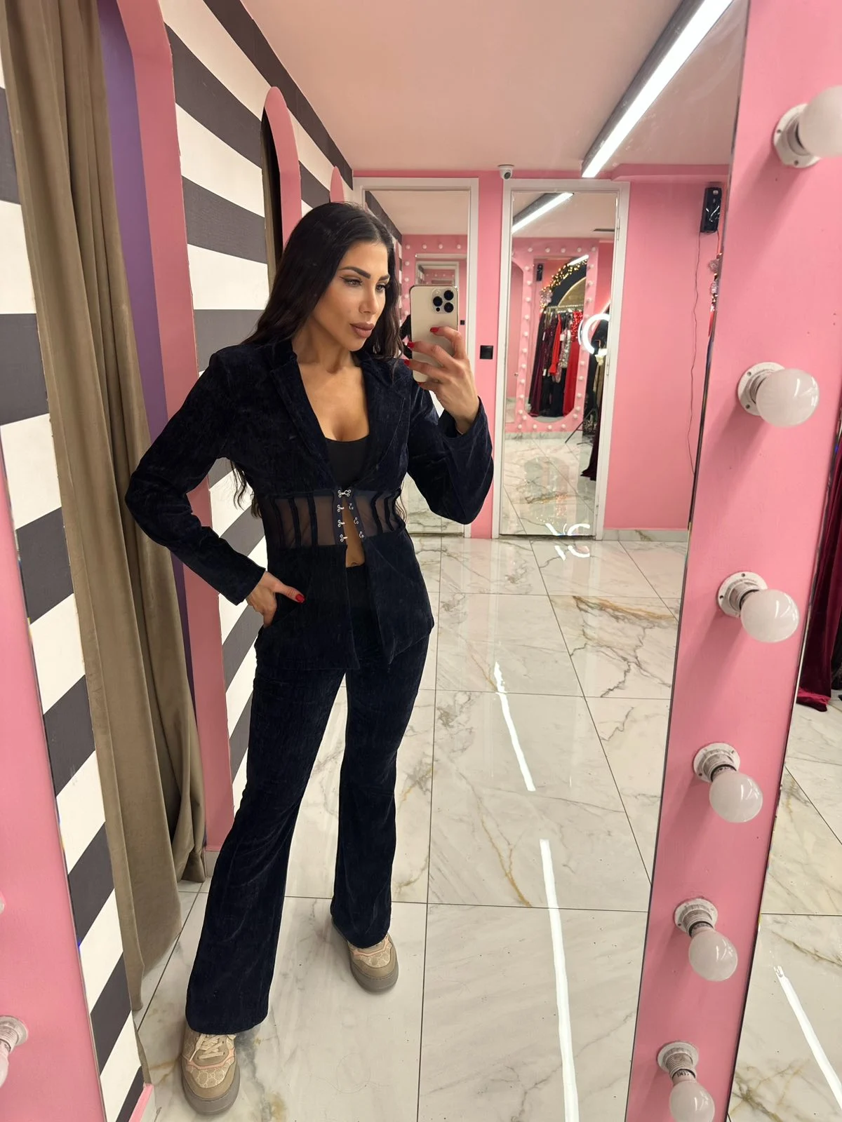 Εντυπωσιακό σετ κουστούμι με ιδιαίτερη μέση κορσέ από διαφάνεια που αγκαλιάζει τη σιλουέτα και αναδεικνύει το σώμα. Το σακάκι διαθέτει μοναδικό design με μεταλλικά κουμπώματα στο μπροστινό μέρος, ενώ το παντελόνι έχει άνετη γραμμή για κομψή αλλά sexy εμφάνιση. Ιδανικό για βραδινές εξόδους και fashion-forward looks.