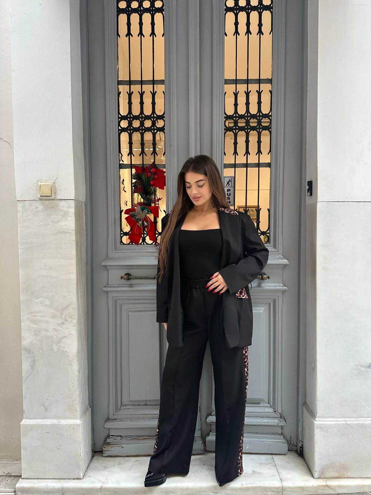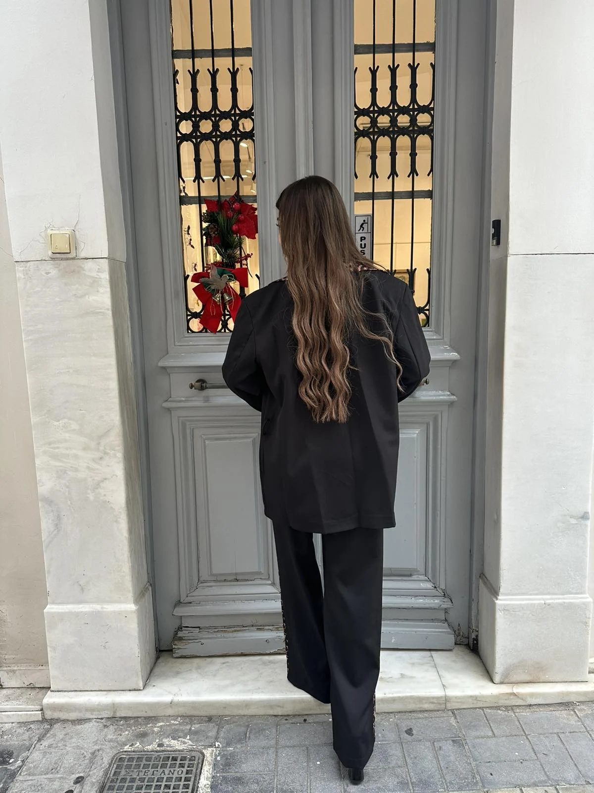 Minimal και διαχρονικό μαύρο σετ κοστουμιού που ξεχωρίζει για τη θηλυκή του γραμμή. Διαθέτει ζώνη που αγκαλιάζει τη μέση και αναδεικνύει τη σιλουέτα, κάνοντάς το ιδανικό για πιο προσεγμένες εμφανίσεις.