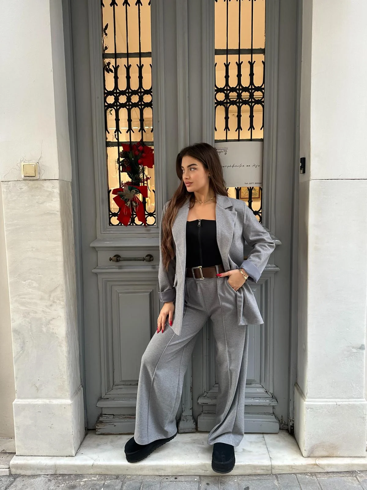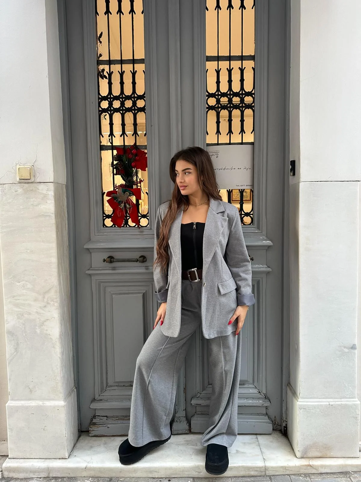 Κομψό και άνετο σετ κοστουμιού σε γκρι απόχρωση, ιδανικό για καθημερινές αλλά και πιο προσεγμένες εμφανίσεις. Το σακάκι έχει χαλαρή γραμμή με ρεβέρ, ενώ το παντελόνι διαθέτει άνετη εφαρμογή που κολακεύει τη σιλουέτα. Ένα σετ που φοριέται εύκολα από το πρωί έως το βράδυ.