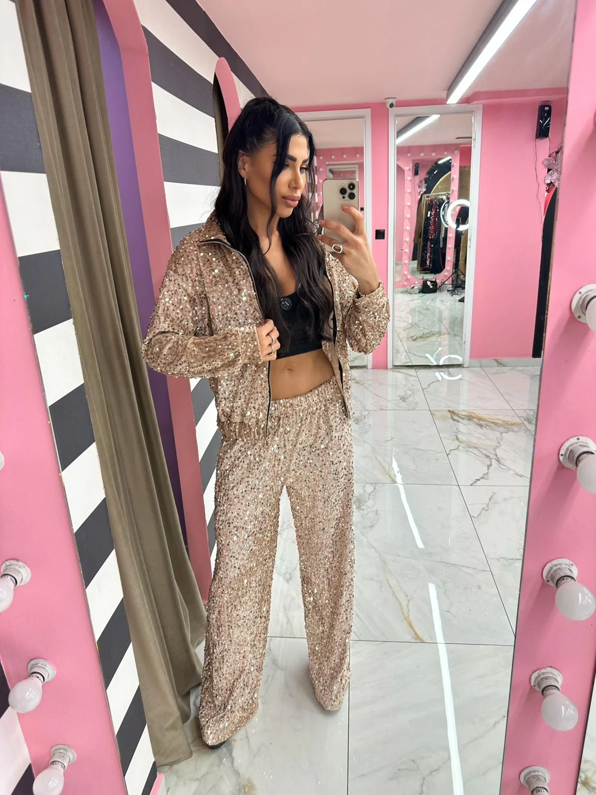 Αριστοκρατικό σετ σε champagne απόχρωση που αποπνέει πολυτέλεια και κομψότητα. Τέλειο για ιδιαίτερες βραδινές εμφανίσεις και επίσημα events.
