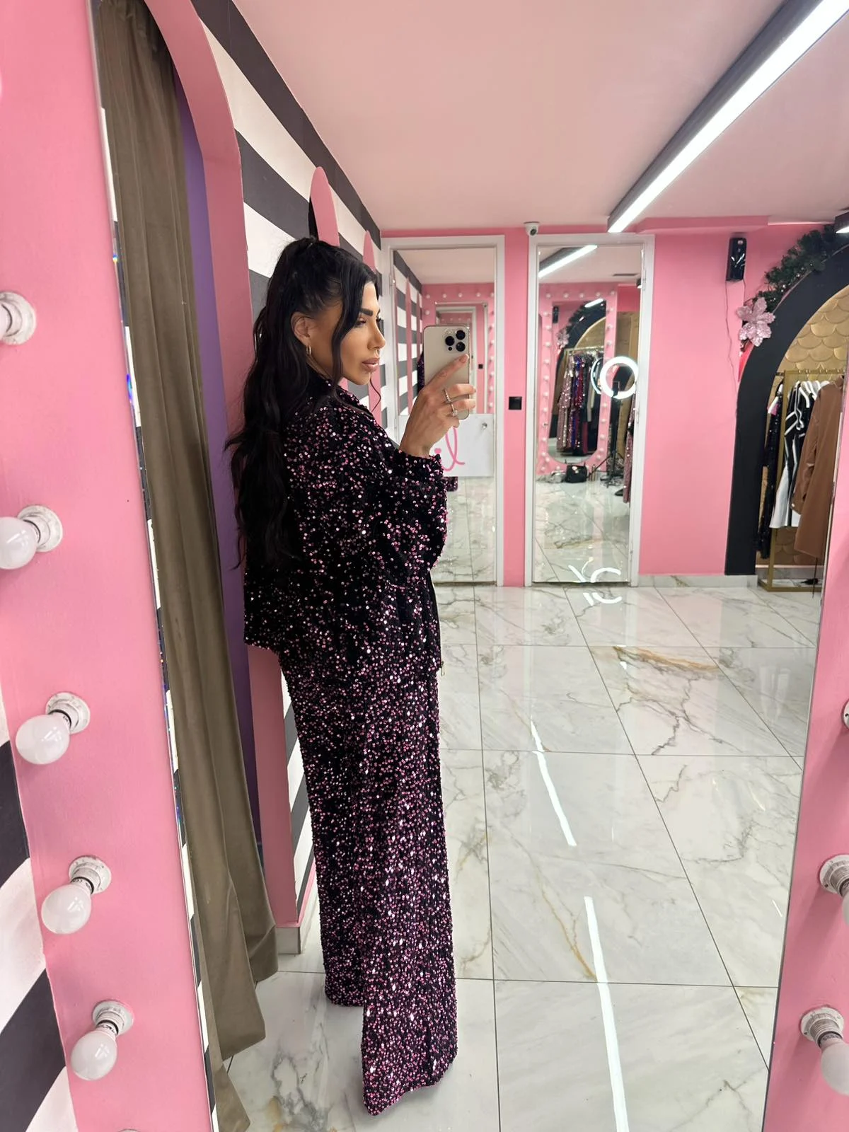 Εντυπωσιακό σετ με μωβ πούλιες σε μαύρη βάση για ultra glam αποτέλεσμα. Ιδανικό για όσες αγαπούν τις τολμηρές βραδινές εμφανίσεις.